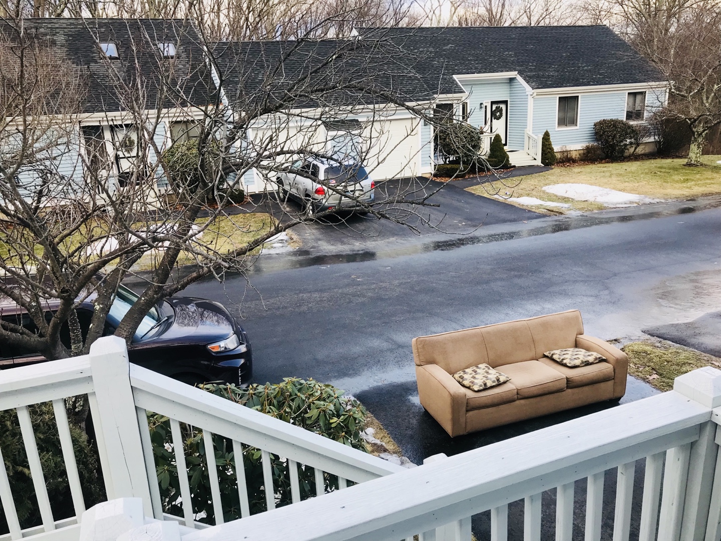 After dragging the sofa out of the garage and placing it at the end of the driveway, I tossed the two pillows on it and went back into the house. While getting breakfast ready, I looked out the window, and the two pillows and the line under the 3 cushions seemed to make a face. A pleased face, proud of its years of service. A content face, for no longer needing to support my bony ass every night. And a face anticipating a peaceful rest of its own, having lived a life with a thankful man.